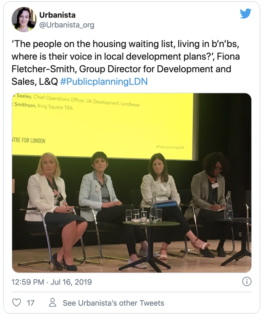 - Community groups get marginalised again and again, but we heard from some very inspiring activists who’ve done amazing work in their own neighbourhoods. They can be an invaluable resource, especially in terms of local knowledge – developers aren’t usually local to the area they’re building in. As Michael Ball from Waterloo Community Development Group said, ‘community groups are the canaries in the mine. [They] know what works and what doesn’t.’